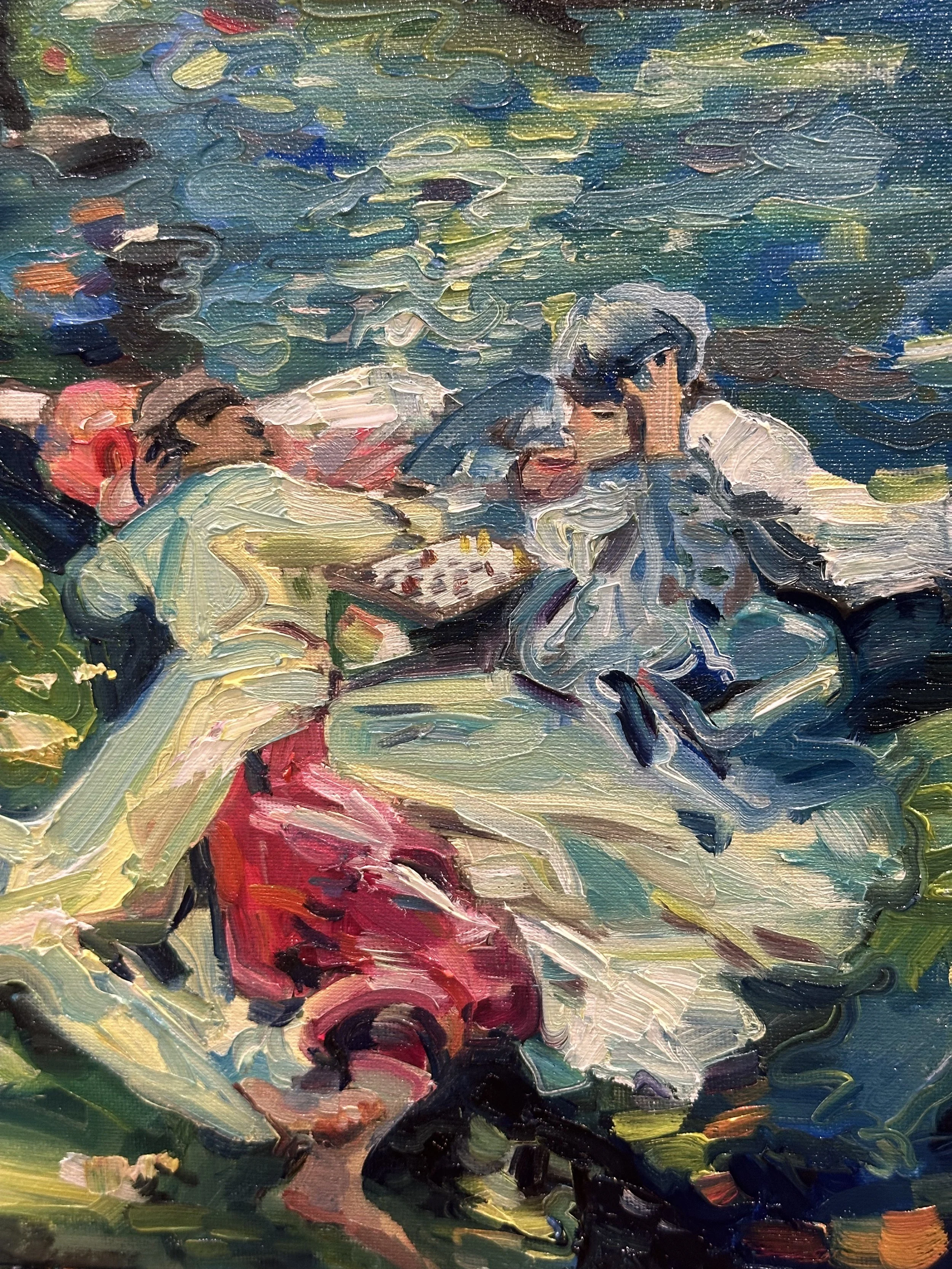 As I was working on this painting, I realized that I hadn’t seen many European or western “oriental” or orientalist paintings featuring people near water. Usually there’s more canvas space given to buildings or desert scenes. The painting is a lot like a Monet in that it features water and water vegetation, and it gave Sargent a place to flourish because it featured people in traditional Turkish clothes. Anything silky or with a sheen seemed to suit Sargent very well.